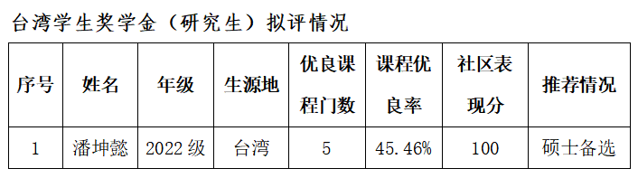 根据《华侨大学港澳及华侨学生奖学金管理办法》、《华侨大学台湾学生奖学金管理办法》等文件精神和相关规定,学院组成奖学金评定领导小组,严格按照奖学金评选规定,确定各奖学金的拟评人选。现将材料学院2025年度教育部港澳及华侨学生奖学金、台湾学生奖学金拟评名单公示如下: