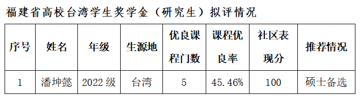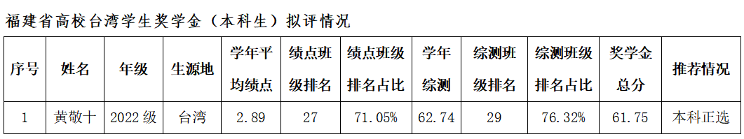根据《华侨大学台湾学生奖学金管理办法》等文件精神和相关规定,学院组成奖学金评定领导小组,严格按照奖学金评选规定,确定各奖学金的拟评人选。现将材料学院2025年度福建省高校台湾学生奖学金拟评名单公示如下: