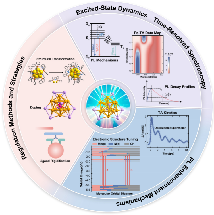 图1 金属纳米团簇激发态动力学、光致发光增强机制及光学性质调控策略示意图概览。