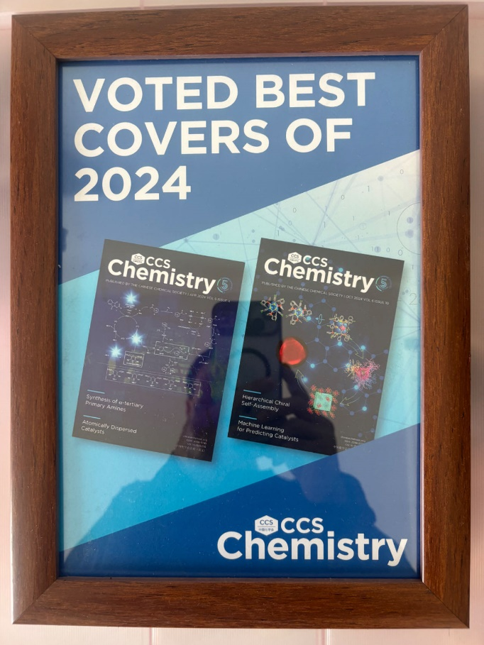 此外,骆耿耿课题组先前发表于《CCS Chemistry》2024年第10期的金属纳米团簇近红外相关的研究论文,在该刊2024年度读者最喜爱封面评选中(11个国家和地区的上千位读者通过微信、X(原Twitter)及Facebook等多平台参与投票),与南方科技大学舒伟教授、英国伯明翰大学Paul W. Davies教授团队共同荣获“读者最喜爱封面奖”(图2)。