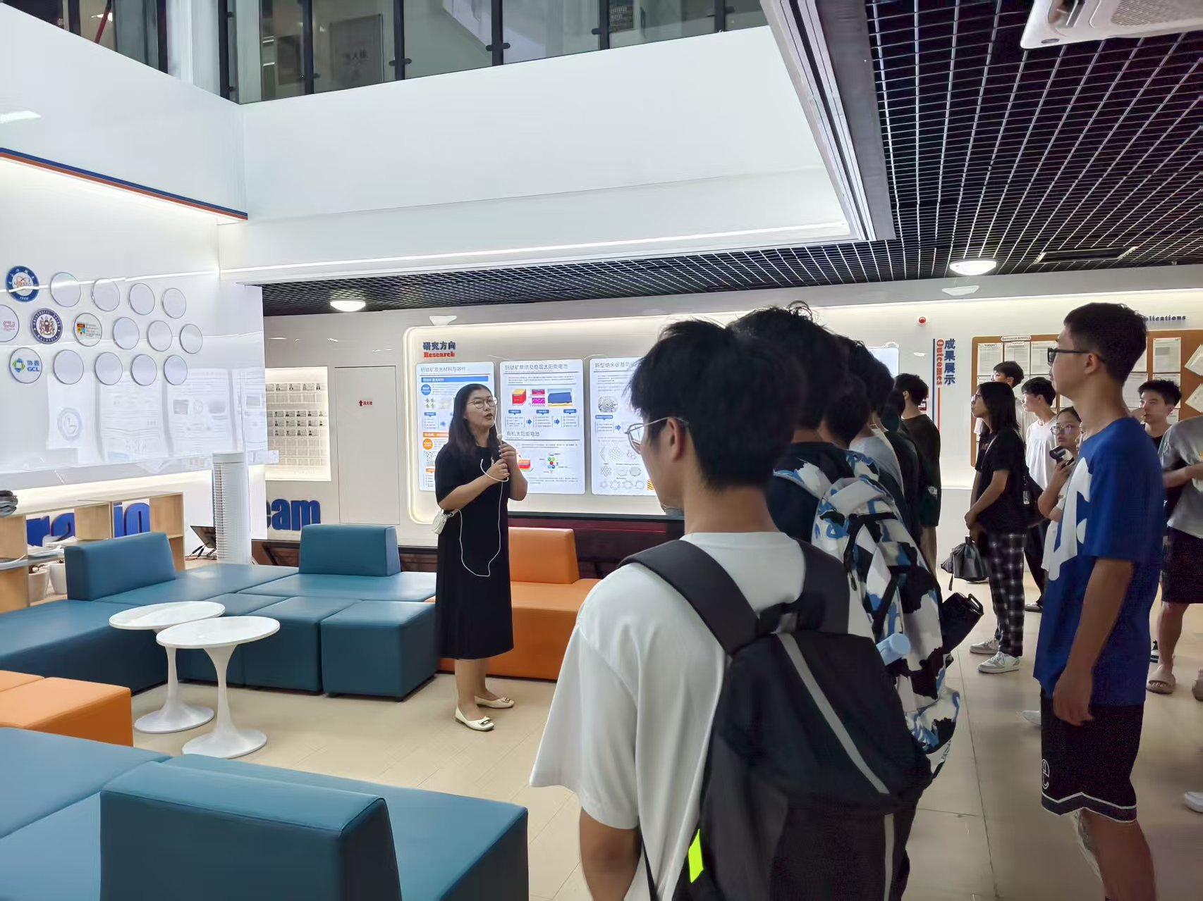 支部教师党员陈凯凯与翁雅恋作为讲解员,全面介绍了研究院的发展历程、研究团队及核心方向。结合国家“双碳”目标与光伏产业发展趋势,阐明了该领域广阔的发展前景。现场讲解聚焦于各研究方向的科学原理、材料特性和应用场景,并展示了研究院近年来的代表性论文成果与专利。详实的讲解与生动的案例引发了在场学生的浓厚兴趣,师生围绕科研课题与技术应用展开了热烈讨论。