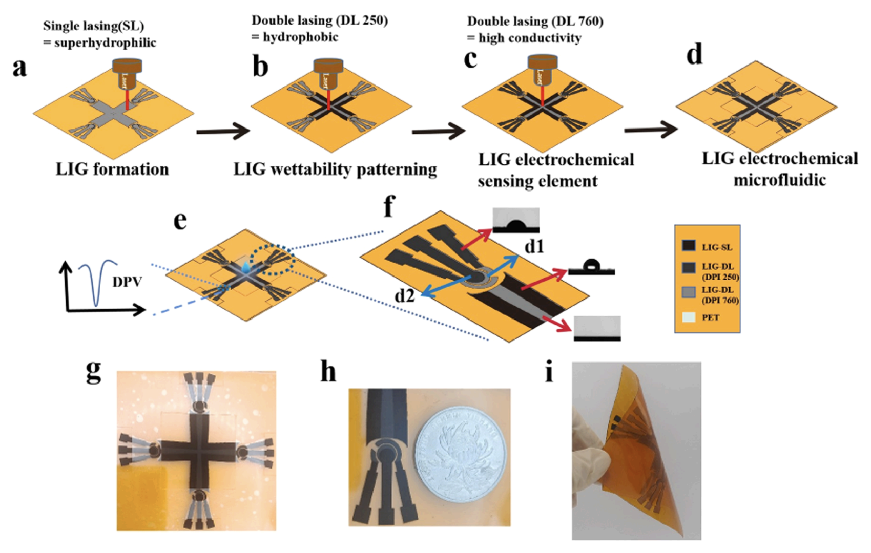 yl23411永利集团官网刘斌/魏晓峰课题组在基于激光诱导石墨烯微流控设备的研制和应用上取得了最新进展。相关研究成果以“Modification-free pumpless laser-induced graphene multichannel open microfluidic electrode chip for simultaneous quantification of dual targets”为题及全文形式在线发表于化学类期刊《Sensors and Actuators B: Chemical》(Sensors and Actuators B: Chemical, 400(2024) 134905;影响因子:8.4)。Sensors And Actuators B: Chemical是一本以工程技术-电化学综合研究为特色的国际期刊。该刊由SAGE PUBLICATIONS INC出版商创刊于1990年,刊期Monthly。期刊聚焦工程技术-电化学领域的重点研究和前沿进展,及时刊载和报道该领域的研究成果,致力于成为该领域同行进行快速学术交流的信息窗口与平台,已被国际重要权威数据库SCIE、SCI收录。