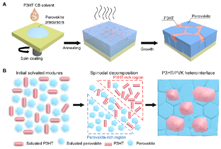 图1. P3HT/PVK 异质界面的形成。 (A) P3HT/PVK 原位制备示意图。 (B) 旋节线分解的演化模型。
