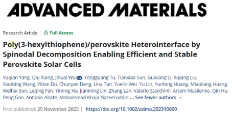 近日,材料科学与工程学院吴季怀教授研究团队在钙钛矿太阳能电池领域取得了新进展。相关成果以题为"Poly(3-hexylthiophene)/perovskite Heterointerface by Spinodal Decomposition Enabling Efficient and Stable Perovskite Solar Cells”在国际顶级期刊《Advanced Materials》(Adv. Mater.2023, 2310800)上发表。Advanced Materials是美国Wiley出版社旗下的材料与化学领域的顶级期刊,当前影响因子为32.086。