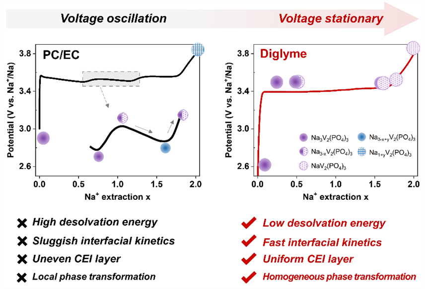 鉴于此,阙兰芳副教授研究团队根据前期关于低温金属离子电池与理论计算的研究工作积累(Angew. Chem. Int. Ed. 2022, 61, e202213416;Adv. Mater. 2023, 35,2307592),在本研究中聚焦SIBs低温电压振荡的起源及其控制因素,通过电化学测试、原位表征并结合理论计算模拟,探究了NVP(磷酸钒)正极在PC(碳酸丙烯)/EC(碳酸乙烯)基电解质中的电压振荡行为,并证实该现象与材料在低温下的局域相转变密切相关;揭示了影响NVP正极在PC/EC基电解质中低温局部相变的主要因素,进而提出消除低温电压振荡的策略,构建了兼具良好低温适应性与优异循环稳定性的钠离子全电池。本研究为解决SIBs在极端工况环境下所面临的性能限制和稳定性挑战等问题提供新的思考视角和实施途径。