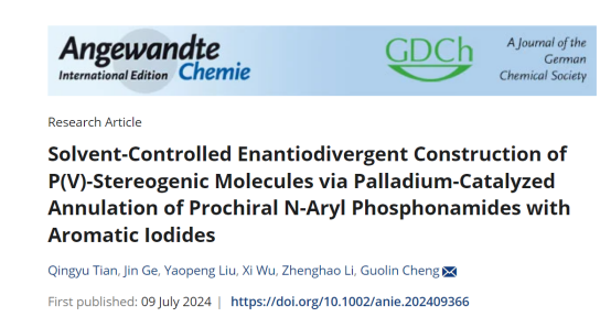 yl23411永利集团官网程国林教授课题组在手性五价磷分子的多样性构建方面取得了重要进展。研究成果以“Solvent-Controlled Enantiodivergent Construction of P(V)-Stereogenic Molecules via Palladium-Catalyzed Annulation of Prochiral N-Aryl Phosphonamides with Aromatic Iodides” 为题发表于国际著名学术期刊《Angewandte Chemie》(德国应用化学)。Angewandte Chemie创刊于1888年,由Wiley-VCH出版社出版,是国际化学和材料领域最具影响力的顶级综合性刊物之一。