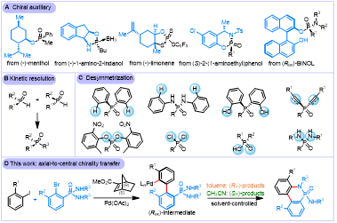程国林教授课题组长期致力于Catellani反应研究(J. Am. Chem. Soc. 2020, 142, 14864; Angew. Chem. Int. Ed. 2017, 56, 8183;ACS Catal. 2020, 10, 10516;Org. Lett. 2018, 20, 4984;J. Org. Chem. 2018, 83, 12683;J. Org. Chem. 2020, 85, 13280;J. Org. Chem. 2023, 88, 11793)。在此研究基础上,他们开发了一种溶剂控制的钯/手性降冰片烯(NBE)催化的芳基碘化物与磷酰胺的环化反应。该方法对芳基碘和磷酰胺底物都有广泛的应用范围,并且能够使用单一手性NBE催化剂对映选择性地获得手性P(V)分子的两种对映体。
