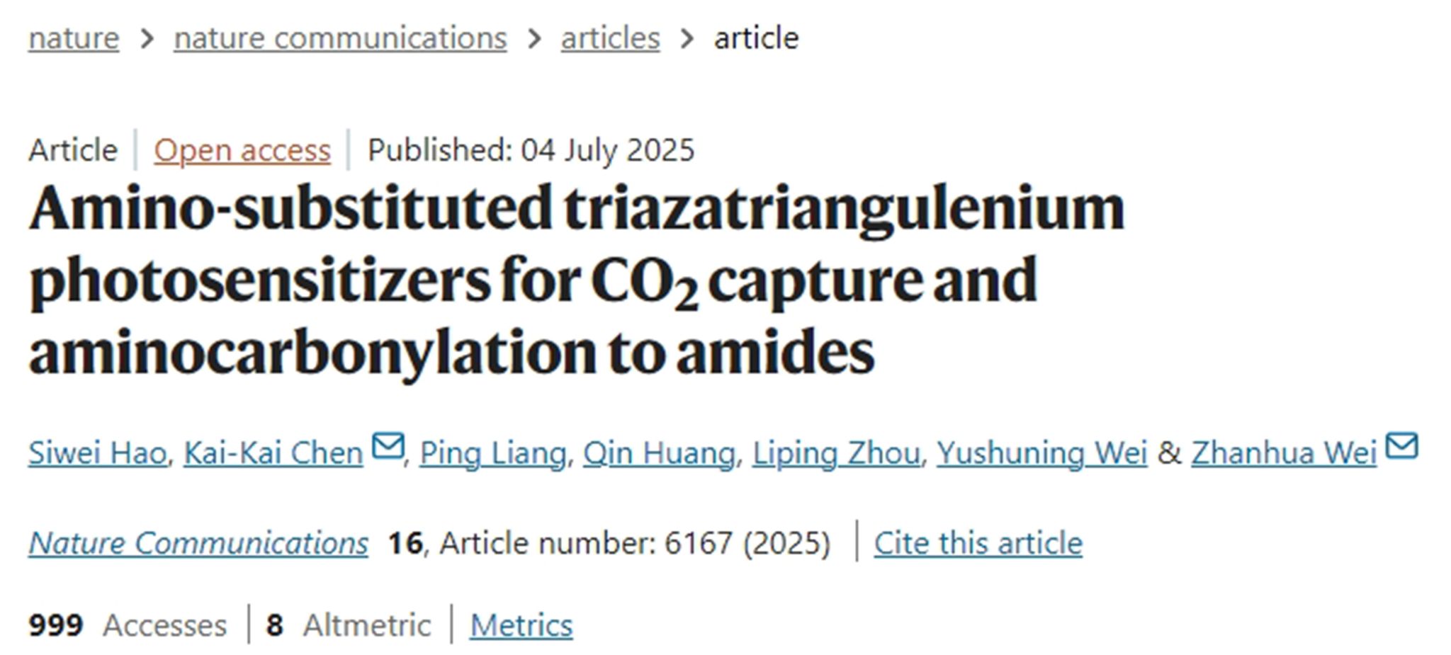 近日,我校发光材料与信息显示研究院、材料科学与工程学院陈凯凯讲师与魏展画教授团队,在国际顶级期刊Nature Communications《自然-通讯》上发表了题目为“Amino-substituted triazatriangulenium photosensitizers for CO2 capture and aminocarbonylation to amides”的研究论文。